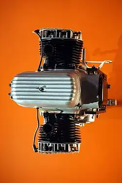 According to the American Motorcyclist Association's Motorcycle Hall of Fame Museum, regarding the World-War-II-vintage Harley-Davidson XA, which has an opposed twin engine — "Mechanically, the large cooling fins stuck straight out in the breeze, reportedly keeping the XA’s oil temperature 100 °F (38 °C) cooler than a standard Harley 45."[4] The latter was a transversely mounted V-twin, in which the air stream cannot reach the cylinders, especially the rear cylinder, as efficiently as a longitudinally mounted flat twin. The use of "transverse" and "longitudinal" here follows motor car convention based on crankshaft alignment. However, with motorcycles the convention is based on width - hence cylinder orientation. Therefore, a flat or v-twin with left and right cylinders is transverse but with front and rear cylinders it is longitudinal.