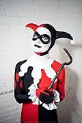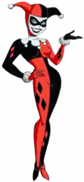 In designing the character, Timm did a "simplified supervillain version" of traditional Harlequin gear; from the commedia dell'arte original, he took the jester hat, ruffled collar, diamond pattern, and domino mask and put them on a red-and-black bodysuit, on which the diamonds were strategically placed for easier animation.[8][15] Timm took Harley Quinn's red and black color scheme from the Golden Age comic book character Daredevil.[8] Dini had previously made a rough design for the character, which Timm improved on.[12]