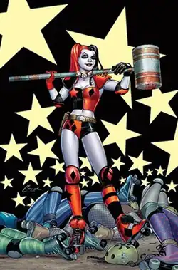 In contrast to Harley Quinn's depiction in Glass' Suicide Squad, Palmiotti and Conner wrote Harley Quinn with a lighthearted, cartoonish, and humorous tone. Her costume has also been changed with a roller derby-inspired costume designed by Conner, which incorporates Conner's favorite aspects of Harley Quinn's early costume and her costume in Glass' run of Suicide Squad.[68][72][66] The series also brought back Harley Quinn's red and black motif.[60]