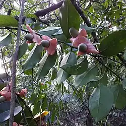 The flowers grow from a raceme 1–1.5 long cm made of 5 flowers. Each flower is small and green. Its fruit is a fleshy, green ovoid drupe with an orange base 2.5–3 cm long by 1.3–2 wide growing out of a huge calyx; it changes colour to yellow or pink-orange when ripe. The seed is 0.5 mm long.[3]: 10