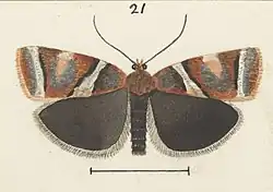 ♂. 16 mm. Head grey. Palpi ferruginous. Antennae fuscous, obscurely ringed with paler, ciliations 1. Thorax fuscous mixed with ochreous-reddish and grey. Abdomen fuscous, segmental divisions grey. Forewings moderate, rather oblong, costa strongly arched, apex obtuse, termen bowed, hardly oblique; bright ochreous-red; fasciae white; first fascia, defining basal patch, outwardly oblique, almost straight, narrowest towards costa, its edges suffusedly margined with blackish, clouded above and below middle with ochreous, median fascia broad, dilated in disc, lower half almost filled with ochreous blotch; subterminal fascia straight, blackish-margined, from ⅚ costa to tornus: cilia pale ochreous with darker basal line. Hindwings fuscous: cilia as in forewings but paler. A shorter-winged species than the preceding; the antennal ciliations are also shorter.[2]