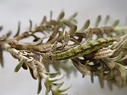 The larva is somewhat flattened, almost uniform in thickness, slightly tapering posteriorly; the head is dull ochreous with four pale brown stripes and several dots; the body pale green with two very broad, rather irregular, clear white dorsal lines interrupted at each segmental division; there is a broad dark green sub-dorsal line and a wavy whitish lateral ridge; the lower portions of the larva are very pale green; segments 3 and 4 have a single row of blackish warts, the other segments, except the last, a double row; each wart emits a bristle; the length of the full-grown larva is about 5⁄8 inch.[6]