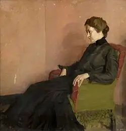 At this time Gilman met the American painter Grace Cornelia Canedy; they had both been copying Velázquez in the Museo del Prado in Madrid. They married on 7 February 1903 in the garden of the United States consulate in Toledo, Spain. The couple settled in London (apart from a visit to her family in Chicago, when Gilman ducked pressure to join the Canedy family business). They had five children, of whom three survived, Elizabeth (born 19 January 1904, in London), Hannah (born 4 February 1905, in Chicago), and David Canedy (born 20 September 1908, at Letchworth Garden City in Hertfordshire).[1] The family address at this time was 15 Westholm Green, Letchworth. Grace Gilman left him in 1909, taking her three children to Chicago. The couple were later divorced.