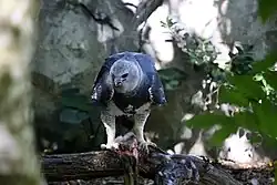The harpy eagle (Harpia harpyja) is a large neotropical species of eagle. It is also called the American harpy eagle to distinguish it from the Papuan eagle, which is sometimes known as the New Guinea harpy eagle or Papuan harpy eagle.[5] It is the largest bird of prey throughout its range,[6] and among the largest extant species of eagles in the world. It usually inhabits tropical lowland rainforests in the upper (emergent) canopy layer. Destruction of its natural habitat has caused it to vanish from many parts of its former range, and it is nearly extirpated from much of Central America. It is the only member of the genus Harpia, which, together with Harpyopsis, Macheiramphus and Morphnus, forms the subfamily Harpiinae.