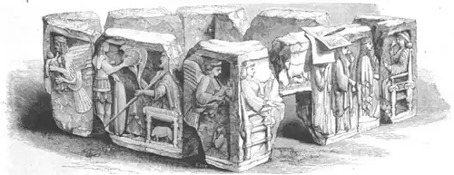 The Harpy Tomb is a marble chamber from a pillar tomb that stands in the abandoned city of Xanthos, capital of ancient Lycia, a region of southwestern Anatolia in what is now Turkey. Built in the Persian Achaemenid Empire,[1] and dating to approximately 480–470 BC, the chamber topped a tall pillar and was decorated with marble panels carved in bas-relief. The tomb was built for an Iranian prince or governor of Xanthus,[2] perhaps Kybernis.