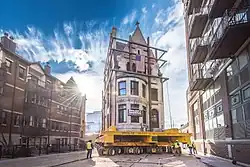 The house was threatened by the development of a new McCormick Place entertainment complex, which will include a basketball stadium for DePaul University and a 1,200-room Marriott Hotel.[4] In lieu of demolishing the building, the Metropolitan Pier and Exposition Authority decided to preserve it by moving it across the street and north one block, at an expense of approximately $6 million, plus $1.9 million for the new lot.[4] On October 1, 2014, the coach house was moved from 2110 S. Prairie Avenue to the new address at 2017 S. Prairie Avenue.[5] The house was moved across the street and in the block north of its original location on November 11–12, 2014.[6] It is one of the heaviest buildings ever moved in America.[4][7][8] The move attracted interest as far away as Reno, Nevada.[9]
