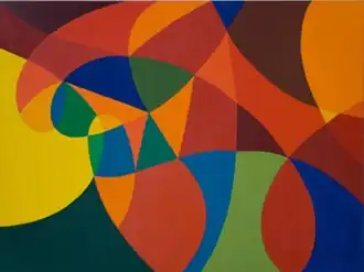 Korman's black-and-white series provided insights that she applied to her next, color series: she would paint without white, which can create illusions of light and space.[46][1][22] She presented the resulting paintings in exhibitions in 2001 and 2004 ("Line or Shape, Curved or Straight"), which feature richly hued, interlocking eccentric forms and unpredictable rhythmic patterns emerging from geometric swoops, curves and grids (e.g., Untitled, 2004; Can Be Joined Any Way, 2002).[32][38][9][47] These paintings explore the way color and abstract images convey meaning.[22] Critics described the work as "curiously out of time"[48]—contemporary yet lightly echoing Miró, Kandinsky, Mondrian, and Tantric Art—and independent of nostalgia and ongoing discourses reviving or rejecting modernism.[49][50]