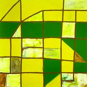 In 1976, Korman shifted to oil paints for greater flexibility and experimented with radically different directions, sometimes at the same time.[27][5] Overall, her work of this period features livelier color, looser wet-on-wet brushwork and more raucous rhythms, which take forms ranging from uneven bands of color and free-form shapes to buckling grid patterns and loosely geometric shapes to gestural lines and scribbles.[5][40][41] Stephen Westfall commended her experimentation in a review of her 1984 exhibition (Willard Gallery), which he described as a "surprisingly warm combination" of witty, slightly ragged touch, rigorous planarity and vivid, emotionally colored ideas.[27]