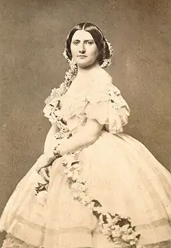 In 1854, she joined him in London, where he was minister to the Court of St. James's. Queen Victoria gave "dear Miss Lane" the rank of ambassador's wife; admiring suitors gave her the fame of a beauty. In appearance "Hal" Lane was of medium height, with masses of light, almost golden-colored hair. She had eyes that were described as "violet colored".[1]