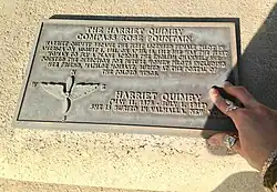 Harriet Quimby died at age 37 and was buried in the Woodlawn Cemetery in The Bronx, New York.[24] The following year her remains were moved to the Kensico Cemetery in Valhalla, New York.[25] A cenotaph to Quimby, the Harriet Quimby Compass Rose Fountain, was erected at Pierce Brothers/Valhalla Memorial Park Cemetery in Burbank, California. Located close to the cemetery's Portal of the Folded Wings, a shrine containing the ashes of aviation pioneers, the Quimby fountain's plaque reads: