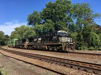Eastbound Norfolk Southern intermodal train on the Harrisburg Line in Valley Forge, Pennsylvania; train traveling on Harrisburg Line's Reading Company main line trackage.