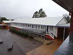 The timber school building with timber floor trusses and the 1959–60 timber school building with open web steel floor trusses are both good, intact examples of their type and demonstrate two iterations of the Department of Public Work's standard designs: incorporating timber floor trusses for unimpeded play space under the classrooms, and later using steel trusses to achieve the same effect. Both buildings retain their: highset character with visible trusses under; large banks of south-facing timber-framed awning windows, with centre-pivoting fanlights; clerestory lighting above the northern verandah roof; and 24-foot (7.3 m) wide classrooms.[1]