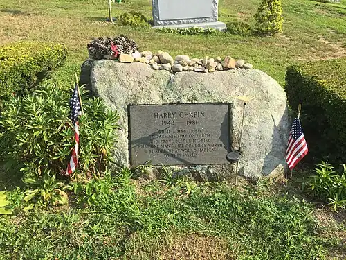 Chapin is buried in the Huntington Rural Cemetery in Huntington, New York. His epitaph is taken from his 1978 song "I Wonder What Would Happen to This World":