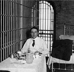 Thaw was charged with first-degree murder and denied bail. A newspaper photo shows Thaw in The Tombs prison seated at a formal table setting, dining on a meal catered for him by Delmonico's restaurant. In the background is further evidence of the preferential treatment provided to him. Conspicuously absent is the standard issue jail cell cot; during his confinement Thaw slept in a brass bed. Exempted from wearing prisoner's garb, he was allowed to wear his own custom-tailored clothes. The jail's doctor was induced to allow Thaw a daily ration of champagne and wine.[31] In his jail cell, it was reported that Thaw heard the heavenly voices of young girls calling to him, which he interpreted as a sign of divine approval. He was in a euphoric mood, unshakable in his belief that the public would applaud the man who had rid the world of the menace of Stanford White.[32]