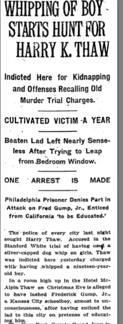 In 1916, Thaw was charged with the kidnapping, beating, and sexual assault of nineteen-year-old Frederick Gump of Kansas City, Missouri. His acquaintance with Gump dated to December 1915, and Thaw had worked to gain the trust of the Gump family. Thaw had enticed Gump to come to New York under the pretense of underwriting the teenager's enrollment at Carnegie Institute, and reserved rooms for him at the Hotel McAlpin. The New York Times later reported that, upon his arrival, Gump was confronted by "Thaw, armed with a short, stocky whip rushing for him." After the assault, Thaw fled to Philadelphia with the police in pursuit. When apprehended, he was found to have attempted suicide by slashing his throat.