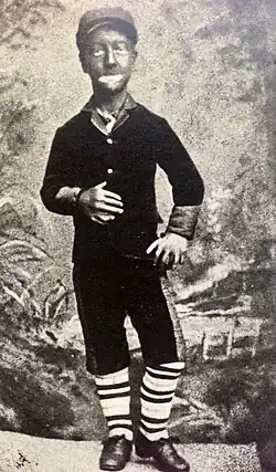 In 1881 Little Tich left home with his sister Agnes, who chaperoned her young brother around the music halls and variety clubs throughout England. By now, he had swapped the tin-whistle for a picco pipe which he used to accompany his clog dancing routine. He despised his early experiences of provincial touring as he was often forced to sleep in dosshouses with very little money or food. To survive, he would often return to busking outside music halls to the waiting audiences.[25] In the early months of 1884, he secured an engagement at a rundown public house called The Dolphin in Kidderminster, where he was paid £2 a week.[26][n 5] He also hired his first agent who, unbeknown to Little Tich, had advertised him as a "freak" and a "six-fingered novelty".[28] The comedian was furious with the description and quickly dispensed with the agent's services.[29] By the summer months, his engagements had become infrequent so he used the long periods of unemployment constructively. He learned how to read and write music and taught himself to play various musical instruments including the piano, fiddle and cello. He also mastered dancing in big boots.[28][n 6]