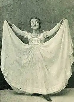 In the early months of 1891, Little Tich completed a successful tour of Germany. Two years later he developed the character Miss Turpentine for his self-choreographed sketch The Serpentine Dance, which he performed over the next three years in Hamburg, Geneva, Rotterdam, Brussels, Nice, Monte Carlo, Barcelona and Budapest; the tour also enabled him to become fluent in French, German, Italian and Spanish.[75] He portrayed Miss Turpentine as an eccentric ballerina who wore an ill-fitting tutu. The dance was a comic variation of the well-known skirt dance belonging to Loie Fuller, which had been popular in France years earlier.[76] Another successful characterisation was that of an eccentric Spanish dancer, which Little Tich devised while touring Europe, and like The Serpentine Dance, relied heavily on acrobatic choreography and comic miming rather than eccentric singing and joke reciting.[77]