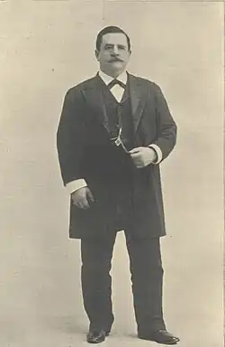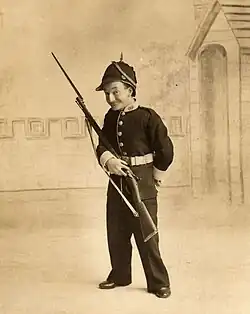 In 1910, Little Tich became the adoptive father of Rodolphe Knoepper,[n 20] an orphan born in 1899 to the brother of the Russian acrobat Harry Alaska. Alaska had previously worked for Little Tich as his dresser and after his death, Knoepper moved into the Relph residence in France and started his education there. After a few months of living with Little Tich, he was moved to London to stay with Julia. In later years Little Tich's daughter Mary said that her father treated Knoepper as more of a son than Paul, who became estranged from the family by the 1920s.[114] While in Paris in 1910, Little Tich was made an officer of the Ordre des Palmes Académiques by the French Ministry of Public Instruction for his services to the stage.[115][116]