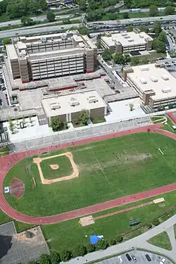 The Truman complex is located on the east side of Baychester Avenue and the New England Thruway in western Co-op City, between sections 1 and 3 of the development. Truman High School sits at the center of the complex, circumscribed by the other four schools and the Truman gymnasium.[3] The high school is seven stories high with a basement, designed for 4,000 students.[17][40][41] The school's gymnasium building is located immediately east of the high school,[3] featuring several dance studios, a wrestling gym, weight room, aerobics facility and a large gymnasium which can be separated into three smaller gyms.[40] Outside at the east end of the complex, the school hosts a multi-purpose grass field for football and baseball surrounded by a six-lane track and field competition area, along with five tennis courts and handball courts.[3][40][42]