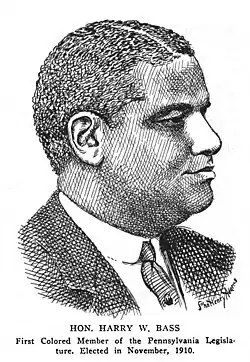 Harry W. Bass (4 November 1866 – 9 June 1917) was an American lawyer and politician who became the first African American to serve in the Pennsylvania House of Representatives, winning two consecutive terms in 1911 and 1913 to represent the sixth district (including primarily black seventh ward) of Philadelphia.
