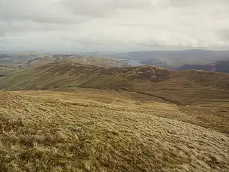 The view from the summit is restricted both by the higher ridge to the west, and by intervening land to the east which conceals most of Ullswater.[1] There are distant glimpses of Catstye Cam and Helvellyn, a closer view of Great Dodd and Stybarrow Dodd across Deepdale, and even a glimpse of Scafell Pike through the gap between Green Side and Stybarrow Dodd.[2]
