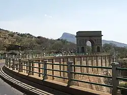 Hartbeespoort Dam (also known as Harties) is an arch type dam situated in the North West Province of South Africa. It lies in a valley to the south of the Magaliesberg mountain range and north of the Witwatersberg mountain range, about 35 kilometres north west of Johannesburg and 20 kilometres west of Pretoria. The name of the dam means "dam at the gorge of the hartebeest" (a species of antelope) in Afrikaans. This "poort" in the Magaliesberg was a popular spot for hunters, where they cornered and shot the hartebeest.[2] The dam was originally designed for irrigation, which is currently its primary use, as well as for domestic and industrial use.[3] The dam is considered to be in a hypereutrophic state since the early 1970s. Mismanagement of waste water treatment from urban zones within the Hartbeespoort Dam catchment area is largely to blame, having distorted the food web with over 280 tons of phosphate and nitrate deposits.[4]
