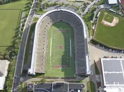 Harvard Stadium is a U-shaped college football stadium in the Allston neighborhood of Boston, Massachusetts. The Stadium is one of only four athletic facilities that are considered National Historic Landmarks.[5] The stadium is owned and operated by Harvard University and is home to the Harvard Crimson football program. In its current form, Harvard Stadium seats just over 25,000 spectators.[6]