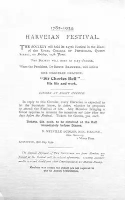 The early Harveian orations in Edinburgh predated the formation of the Society. The first was delivered by Andrew Duncan in 1778 and was entitled 'De laudibus Guilielmi Harvie Oratio'.[1][23] This was the only oration to date delivered in Latin. From 1782 to 1831, the Oration was given at irregular intervals at the Harveian Festival and generally by one of the Secretaries. Since then the Harveian Orations have generally been delivered annually by the President.[1] There is no formal rule about the title or topic of the oration, although many have celebrated the life and works of Harvey. In the first century of the Society's existence, orations often centred around the life and works of a historical figure, who may or may not have been a member of the medical profession. Notable individuals discussed included Sir Henry Raeburn, Archibald Pitcairne, Alexander Munro "Primus" and Sir Joseph Banks.[1][3] During the late 19th and the first half of the 20th century, orations often considered a medical topic. In recent years, orations have tended to consider Harvey's work in the context of areas of medical practice related to the individual President. As of 6 June 2025, there have been 188 Harveian orations in Edinburgh.