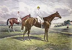 As a two-year-old, Harvester ran six times and won twice. He first appeared at Newmarket at the start of July when he started at 8/1 for the Chesterfield Stakes. He made most of the running before being caught inside the final furlong and beaten one and a half lengths by the filly Superba.[5] A month later, Harvester ran twice in quick succession at Goodwood. He finished unplaced behind Bushey when second favourite for the Richmond Stakes and was unplaced again two days later behind Superba in a Rous Memorial Plate.[6] At Newmarket in October he won the Triennial Produce Stakes from Knight Errant and the Clearwell Stakes,[7] by a head from Condor[8] before returning to the same course later in the month for the Dewhurst Stakes. He ran prominently for much of the way before fading into sixth place behind an unnamed filly who later became known as Queen Adelaide.[9]