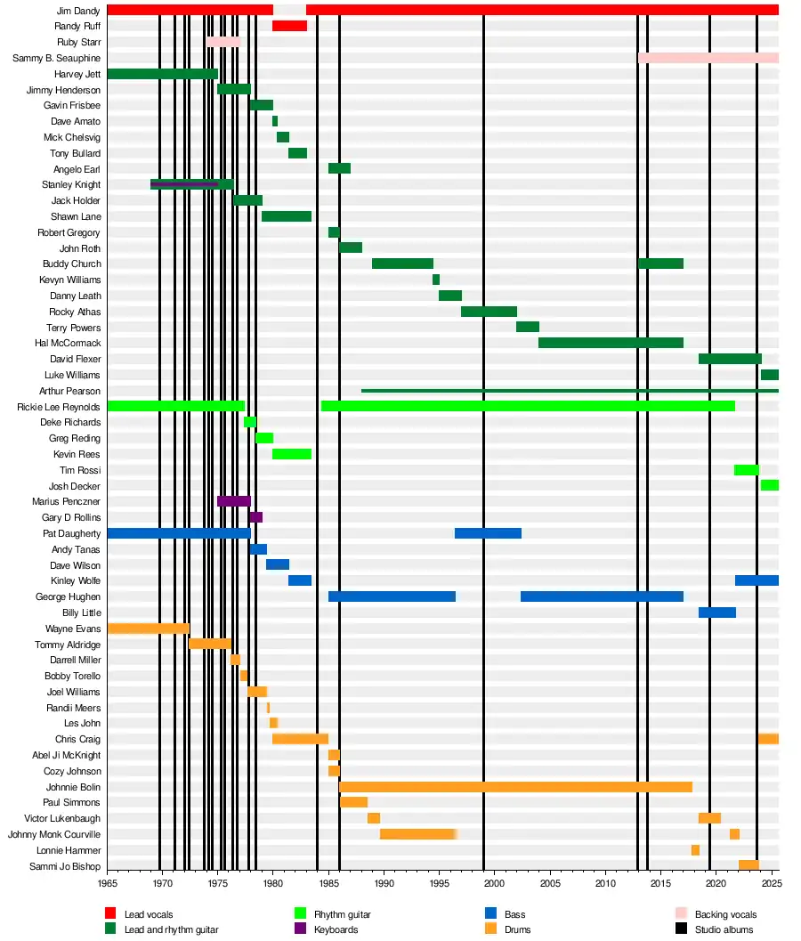 - James L. Mangrum (Jim "Dandy" Mangrum) – lead vocals, guitar, washboard (1968–1980, 1983–present)