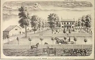 ![]() Drawing of the farm and residence of Harvey Lee Ross, published in 1871. The barn and summer kitchen, shown to southeast of the house in the drawing, are actually to the southwest. | |