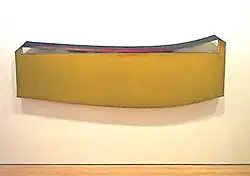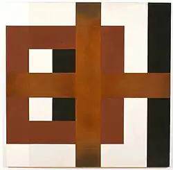 In the late 1960s and 1970s, situated in settings like the Whitney Biennials, his paintings were easily recognized among the crowd due to his masterful use of shaped canvases.[9] They were large, often curved, and frequently enclosing wall space. The painting itself blended elements from abstract expressionism and geometric abstraction, over time shifting further towards geometry. The surfaces were never simple. By the 1980s, he returned to the rectangular and square canvas, and eventually to the cruciform (cross) shape, which would become a focus for the next decade. "Harvey Quaytman's shaped canvases are among the most impressive;"[10] and "Some of the best shaped canvases of the last two decades have come from Harvey Quaytman. But in this selection of new work, the painter has, so to speak, drawn in his horns, confining himself to the right angle and in most cases to a cruciform image." -Vivien Raynor, New York Times, 1986[11]