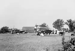 Despite Sweetman's success, the squadron's night-fighting operations were mostly uneventful and after a number of weeks it was switched to day-fighters, converting to the Hawker Typhoon.[11] From October, and now operating from West Malling and then Tangmere, it was regularly flying missions intercepting incoming Luftwaffe Rhubarb missions.[9][10] On one such sortie, on 19 December, he damaged a Focke-Wulf Fw 190 fighter but it disappeared in cloud some 50 miles (80 km) off Bognor.[4][12] He damaged another Fw 190 off Shoreham on 8 February 1943, when he and his wingman were directed by radar to a flight of four Fw 190s in the area.[4][13]