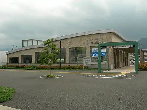 Hashimoto Station (橋本駅) is a subway station on the Fukuoka City Subway Nanakuma Line in Nishi-ku, Fukuoka in Japan. Its station symbol is a picture of maple leaves in front of an orange mountain, because there used to be Momiji-Hachimangu(ja:紅葉八幡宮).