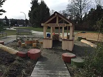 The Vancouver Park board collaborated with the architects at PWL Partnership in order to build a new playground which would be more child friendly and suitable for a wider range of ages.[1] A public open house was conducted in the summer of 2015 in order to gain feedback from the community into the new design.[4] The renovated playground opened in the fall of 2016 and now consists of two tall swings, two toddler swings, two standard swings, adventure log playground and a new playhouse with a sand area.[5] The new playground is made entirely out of wood logs and timber to recall the history of the city's logging pioneer community.[1]