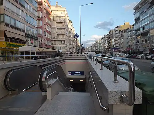 Hatay is an underground station on the M1 Line of the İzmir Metro in Hatay, Konak. Located under İnönü Avenue, it consists of two side platforms servicing two tracks. Connection to ESHOT bus service is available at street level.
