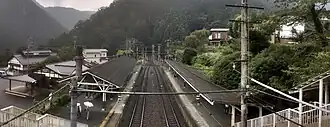 The station has two opposed side platforms serving two tracks. This station can only accommodate trains of 4-car lengths. The station is unattended.