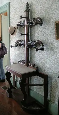 The front hall was the introduction to the house, and as such was an important part of the Victorian home.[1] Furnishings were selected not only to make it a useful place to hang a hat and coat, store an umbrella and leave a calling card, but also to show family wealth, social position and knowledge of current styles.[1] A hall stand or a hatrack was the most important piece of furniture.[1] These were new forms that appeared about 1840, such as the hall tree, as homes became larger and social visits became more structured.[1] Smaller houses had smaller front halls, so a hanging hatrack was the answer to the problem of storing visitors' coats and hats.[1] As well as holding hats and coats, a hall tree could be used to store bags, umbrellas, walking sticks, boots and other items.[1]