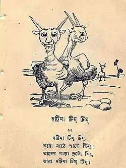 Hattimatim tim (Bengali: হাট্টিমাটিম টিম) is a Bengali folk nursery rhyme. The poem describes the titular hattimatim tim, a peculiar group of animals that lay eggs in fields, and have two horns on their heads.[2]