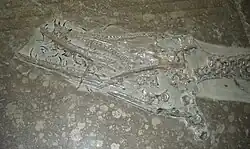 The holotype specimen of Hauffiosaurus, housed in the Hauff Museum, is an almost complete and articulated skeleton, found from the Posidonien-Schiefer, dating to early Toarcian stage of the Early Jurassic. The holotype specimen preserved in a single block of the original matrix, exposed in ventral view. The body outline visible around the specimen is an artifact of preparation, not preservation; no remains of soft tissue were preserved.[1] The skeleton was discovered during the early 19th Century,[3] in beds of the famous Posidonien-Schiefer lagerstätte at Holzmaden, Baden-Württemberg, in southeastern Germany. However, it was not recognized as a valid taxon, and no thorough description of the fossil was made until 2001. The specific name honours Robert Thomas Zanon, who was the first to recognise the specimen as a separate genus.[1]