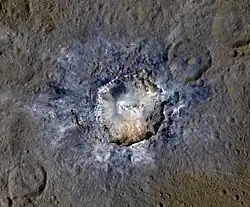 Haulani /haʊˈlɑːni/ is an impact crater located on the dwarf planet Ceres that contains "Spot 1", one of the bright spots observed by the Dawn spacecraft. The crater was named after Haulani, the Hawaiian goddess of plants.[1][2] In July 2018, NASA released a comparison of physical features, including Haulani crater, found on Ceres with similar ones present on Earth.[4]