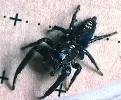 Spiders in this genus follow the generalized salticid body plan, but differ from other genera by the appearance of the epigyne. The cephalothorax is dark with variable whitish setae ornamentation on the face and some white and yellow scales on the frontal surface of chelicerae and the rim of the eyes. The body length varies from less than two up to ten mm.[1]