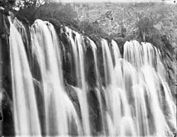 Due to the effects of flash floods, the appearance of Havasu Falls and its plunge pools has changed many times.[3] Before the flood of 1910, water flowed in a near continuous sheet, and was known as Bridal Veil Falls.[4] The notch through which water flows first appeared in 1910, and has changed several times since. Water currently flows as one stream. In the past, there were sometimes multiple streams or a continuous flow over the edge.[5]