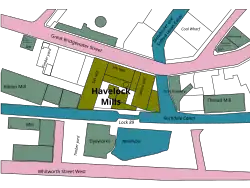 Havelock Mills were two interlinked L-shaped multi-storey mills. They were notable in that the mill built in 1820 was a silk-mill and the second, built in 1840 was a fire-proof cotton mill.