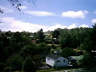 Havelock North is generally hilly, and small gullies have been formed by the creeks and streams flowing from higher ground, resulting in a small amount of inaccessible or steep land which is converted into forests, parks or reserves, giving the image of naturally having many bushes and trees. This is due to the town being situated at the base of the prominent landmark Te Mata Peak, a 399-metre outcrop, which according to local Māori legend is the body of the giant Te Mata o Rongokako,[4] and the depression in the land visible behind his head according to the myth is where he tried to bite through the mountain range which filled his stomach turning him to stone.[5]