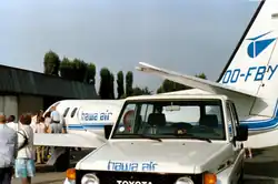 The company was the first European airliner approved for using the Casa C-212-200 planes, which it used to transport mail for the Belgian Post.[1] It received its first Aviocar plane May 26, 1986 for the transport of passengers and cargo. Additionally, Hawa Air was flying with an ACMI Leased Boeing 727 for European destinations as well as a McDonald-Douglas DC9 which flew New York-Brussels five times a week. As mentioned, Hawa Air started the first worldwide courier service, which operated until its closure. It also constructed a state-of-the-art maintenance center for general aviation. Although it was successful and was turning profit for both the airline and Antwerp Airport, Hawa Air was maneuvered to close down under political pressure in 1988.[2]