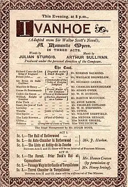 - ^ The Era, 7 February 1891, p. 11. Craven provided the sets for the three scenes of Act II (The Forest, and two interiors in the Castle of Torquilstone). Carte's elaborate production also featured sets by J. Harker (Act I) and Ryan and Telbin (Act III).