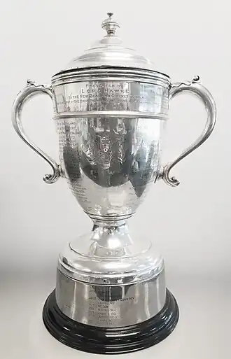 The Plunket Shield, New Zealand's premier cricket competition for its first-class teams, was inaugurated in 1907. In 1910 Lord Hawke donated a challenge cup for competition among the minor associations.[3] The first match, in December 1910, resulted in a victory to Manawatu over Wairarapa.[4] The first holders, decided in the final match of the 1910–11 competition, were Southland.[5]
