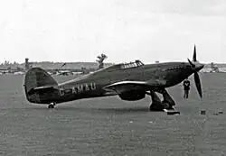 It moved in 1950 to the Hawker factory at Dunsfold Aerodrome and it was given the civil registration G-AMAU on 1 May 1950.[2] It was flown into second place at the 1950 King's Cup Air Race by Group Captain Peter Townsend.[1] At this time it was painted in Hawker Aircraft's dark blue colour scheme with gold lettering and lining. It was used as a chase plane during the P.1127 flight trials.[3] The aircraft also appeared in the Battle of Britain film in 1968.[1]