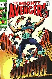 Hawkeye enjoys many adventures with the Avengers and proves himself a hero on numerous occasions. However, when his bow breaks during a crucial moment in a battle, Clint decides to adopt the Goliath costume and identity, succeeding Hank Pym.[20] Barton (as Goliath) was later approached by his brother Barney Barton who was now a big-time racketeer. Barney had learned of Egghead's plans to construct an orbiting laser death-ray to extort money from the United States and came to the Avengers for help. The Avengers confronted Egghead's allies, the Mad Thinker and the Puppet Master. Tragically, Barney died in the ensuing battle;[21] It was later revealed that Barney Barton was actually an undercover FBI agent.[22] Soon after this encounter, Egghead hires the Swordsman to capture Goliath (thinking him to be Pym instead of Clint). Clint defeats and captures both criminals, finding justice for his brother at last. At the conclusion of the Kree-Skrull War Clint resumes the identity of Hawkeye with a new costume. After several adventures, Hawkeye quits the Avengers after a bitter rift with the Vision over the affections of the Scarlet Witch. Barton returns to his original Hawkeye costume and strikes out on his own.[23]
